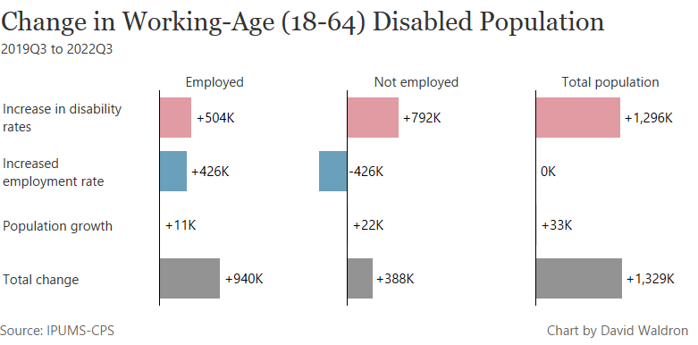 I find that overall, there was an increase of 1.3 million disabled people in the 18 to 64 age group. This increase contributed 504 thousand people to the increase in disabled workers, and 792 thousand to disabled non-workers. Higher employment rates in 2022 can be credited with shifting 426 thousand disabled non-workers to workers. In other words, increased disability accounts for 53.6 percent of the increase in disabled workers, while higher employment rates account for 45.3 percent. Population growth accounts for the remaining 1.1 percent increase.