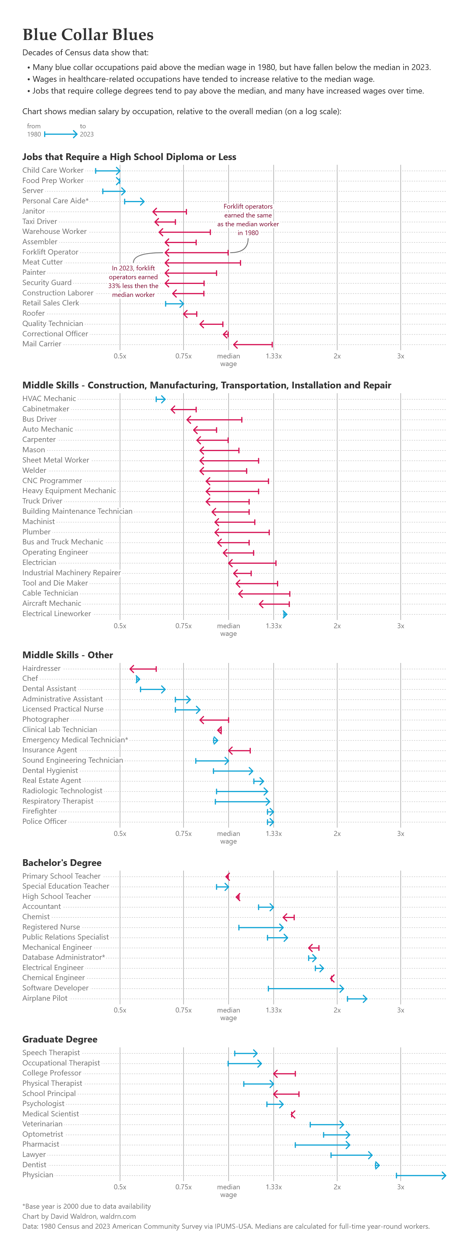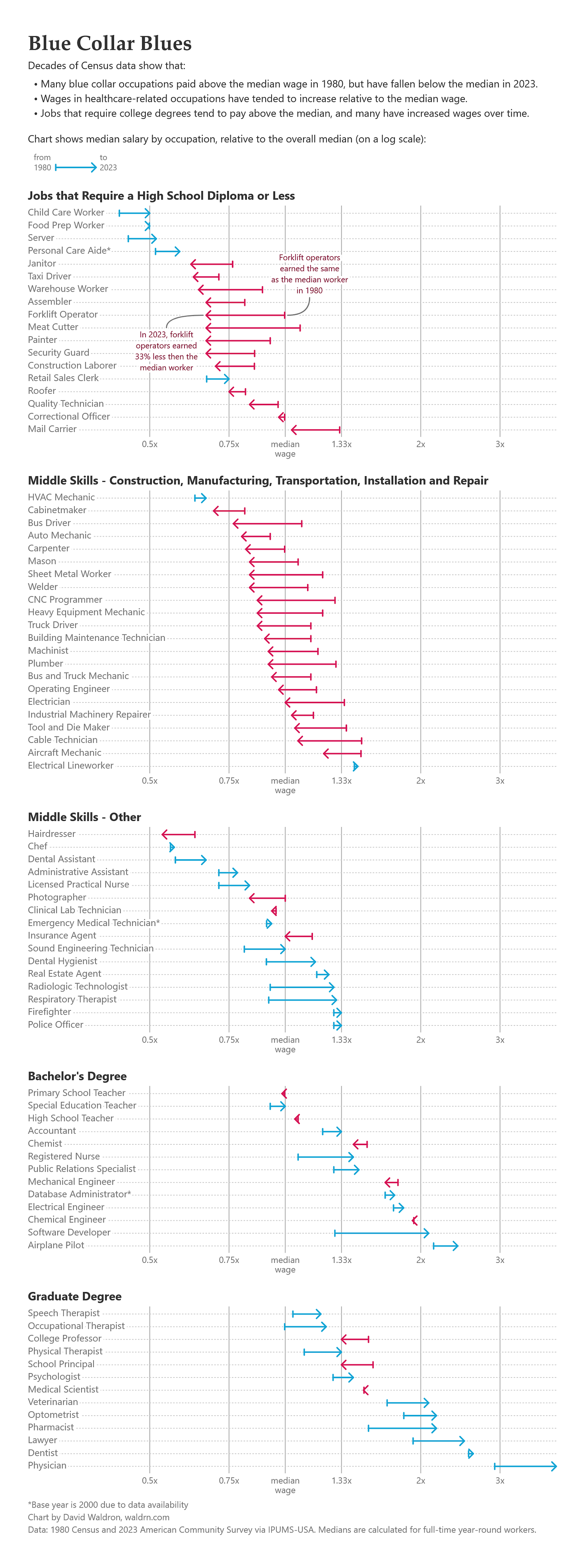 I wonder how much of the relative depression in blue collar wages is caused by illegal immigration increasing the supply of workers. Where I live (California) the trades are almost entirely done by folks of Mexican descent, and statistically quite a few are undocumented.