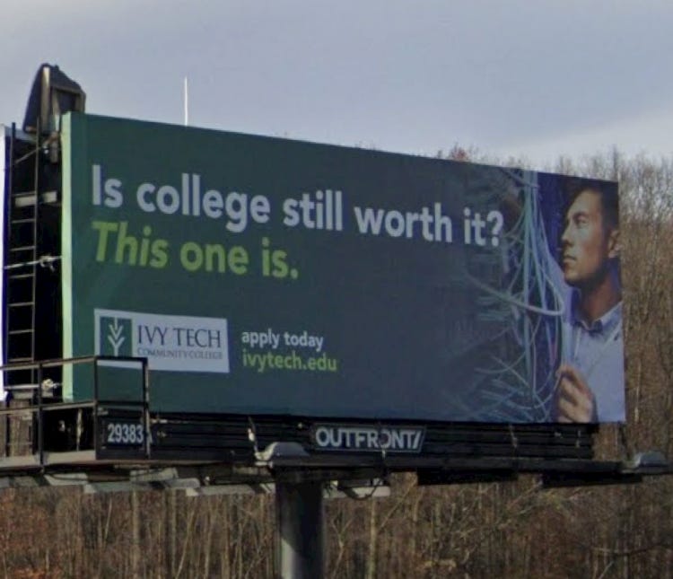 To the general public, this might be surprising. Skepticism about the value of college has become broadly popular. People focus on rising sticker prices without realizing that expanding financial aid has kept the net cost of college attendance basically flat for many years. “Skip college, learn a trade” has become a popular mantra among adults advising younger generations. Mike Rowe and other commentators routinely disparage college education, while touting an always-approaching shortage of non-college-educated workers. Even advertising by Indiana’s public community college system subtly suggests that 4-year colleges are a bad deal: